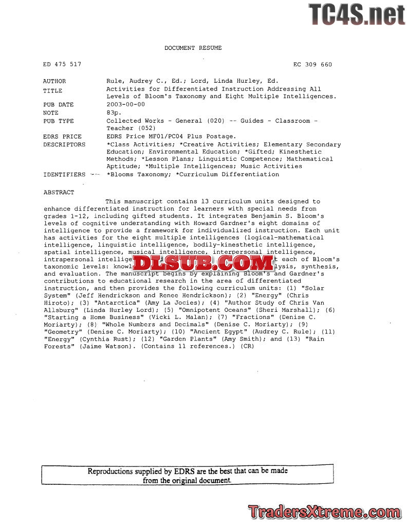 Activities For Differentiated Instruction Addressing All Levels Of Blooms Taxonomy And Eight Multiple Intelligences - JPG Image File